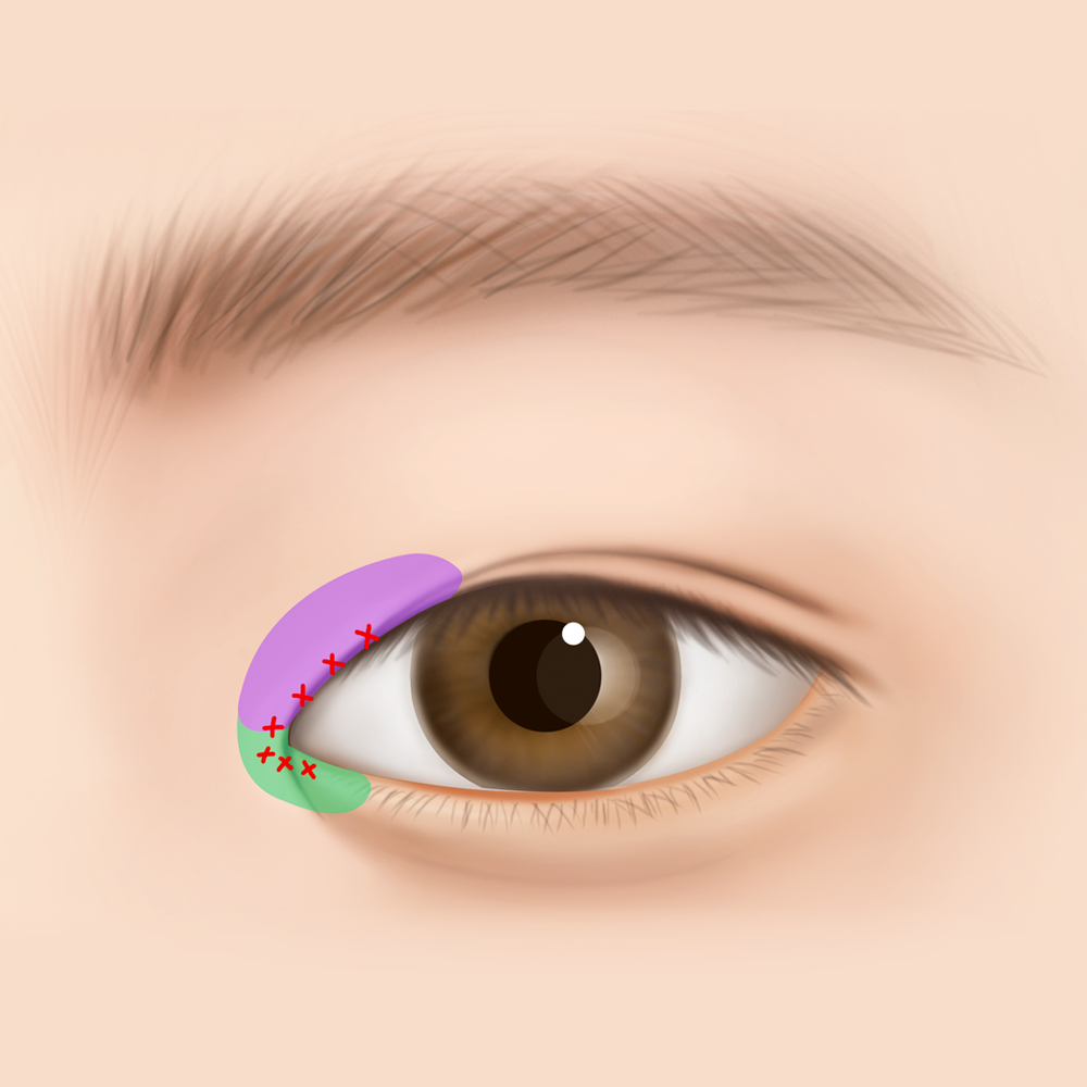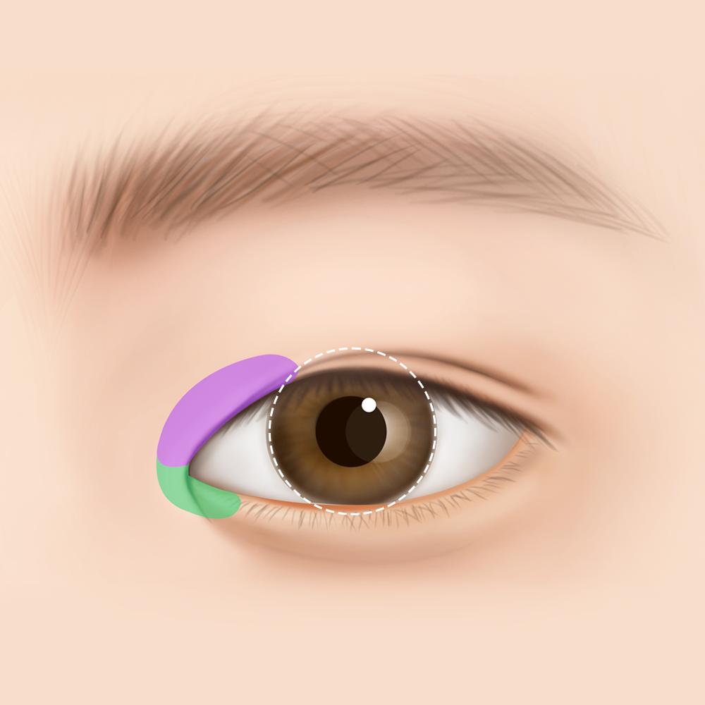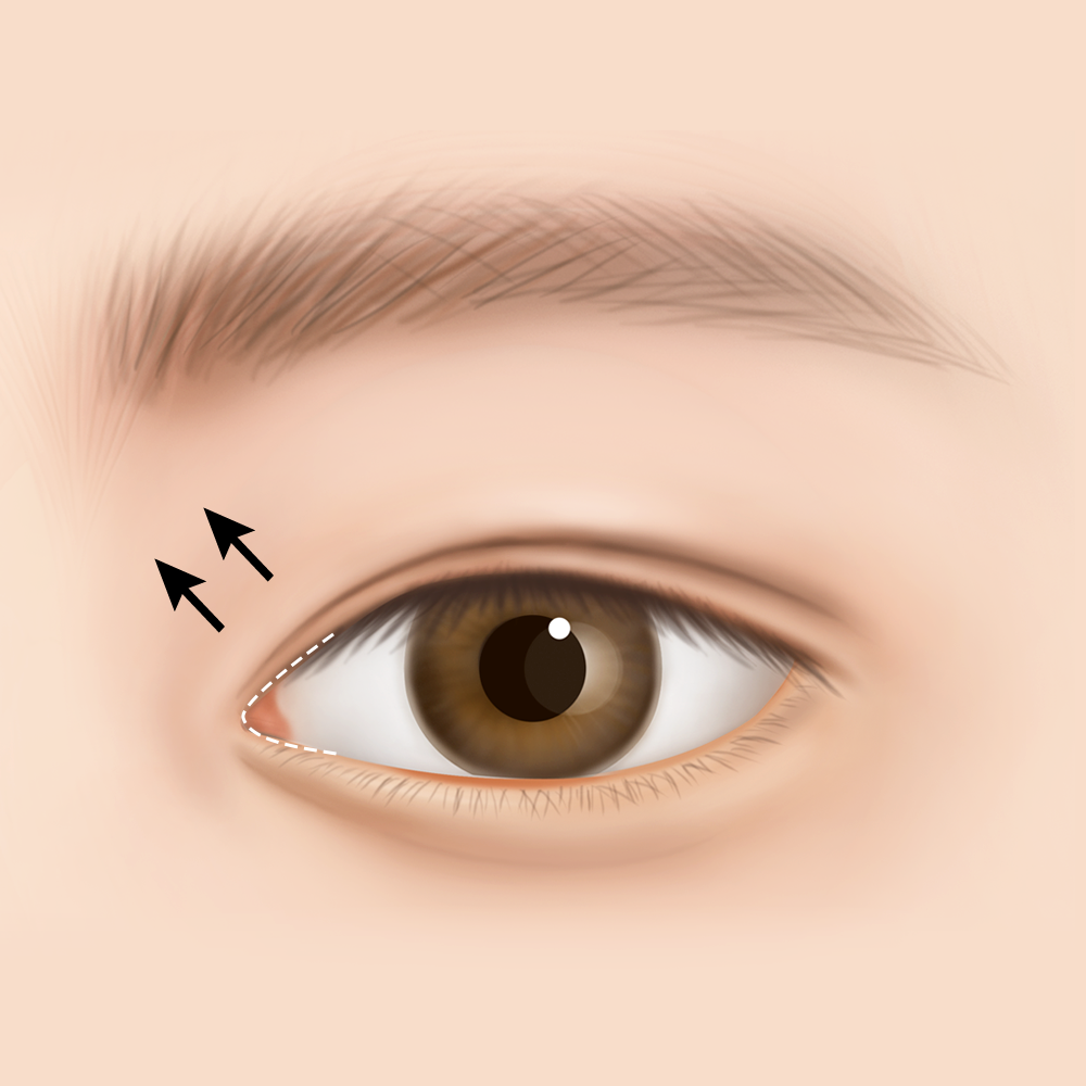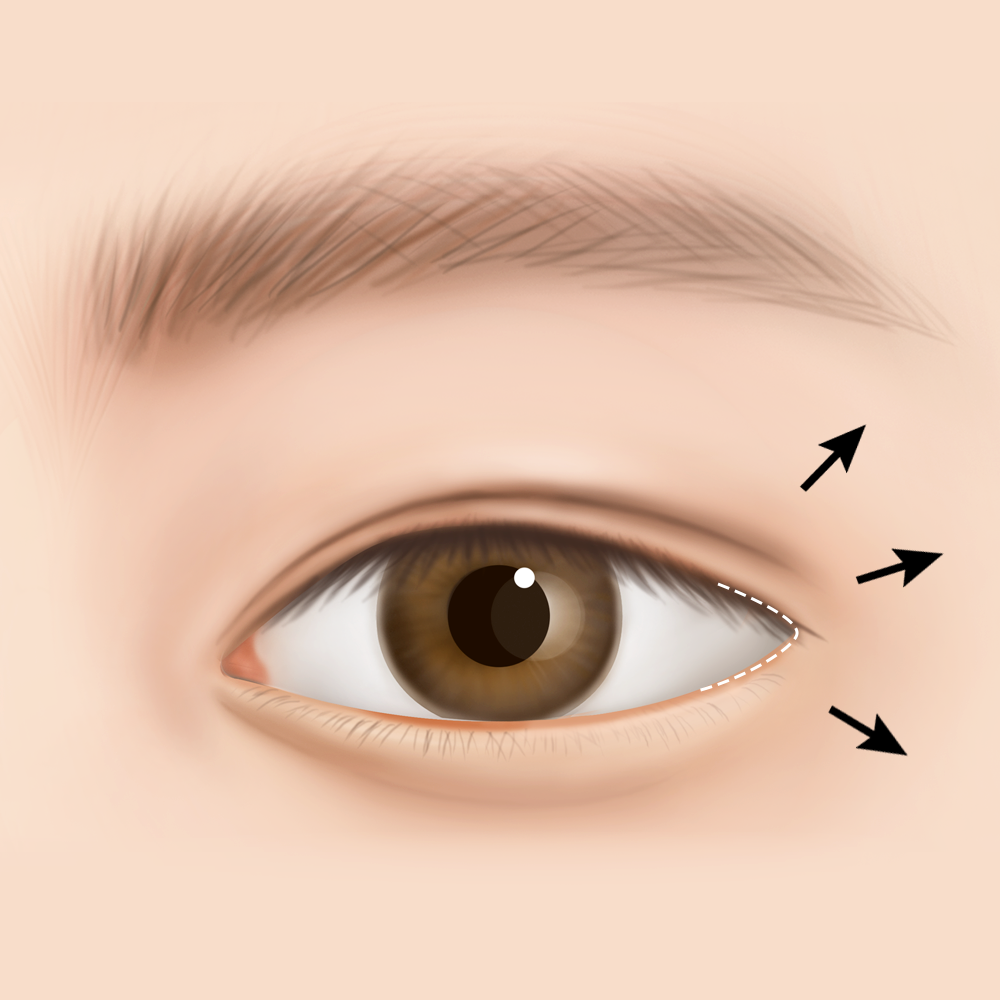 눈꼬리를 수직으로 당겨 세로 길이를 늘려줌으로써, 눈의 크기를 키울 수 있으며 전체적인 이미지 개선의 효과가 있습니다.