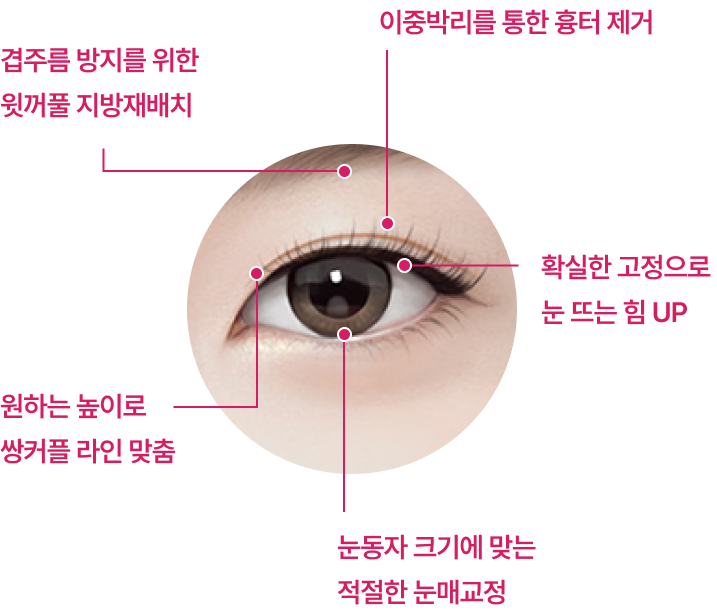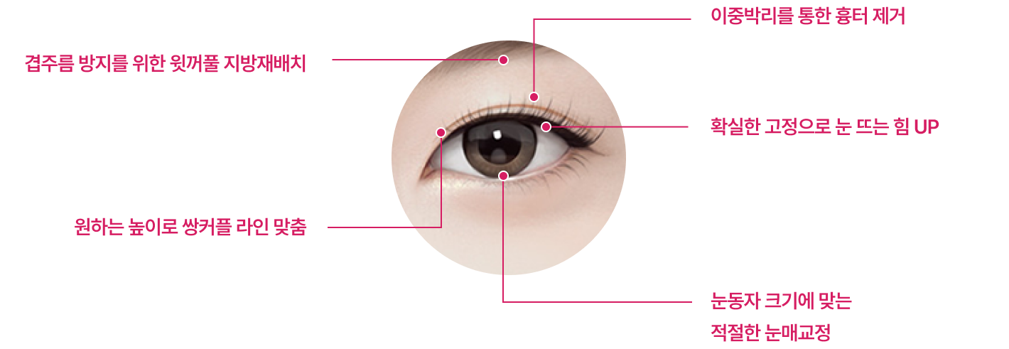 1차 수술에 비해 조직의 손상이 크므로 눈의 구조와 변형을 고려해 섬세하게 교정하여 가급적 최소환의 출혈과 부기로 빠른 회복이 가능합니다.