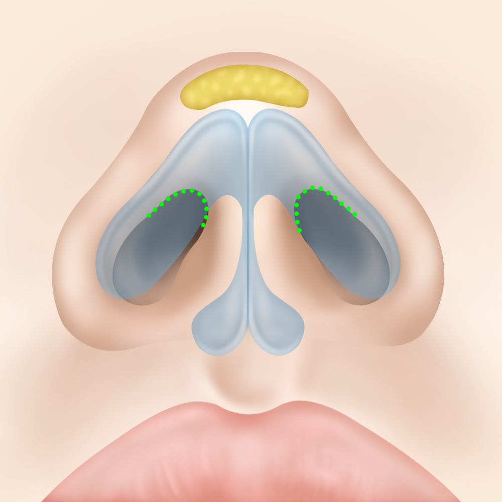 이런 경우 코 끝 부위의 날개 연골이 과도하게 발육되어 있거나 옆으로 퍼져서 벌어진 경우