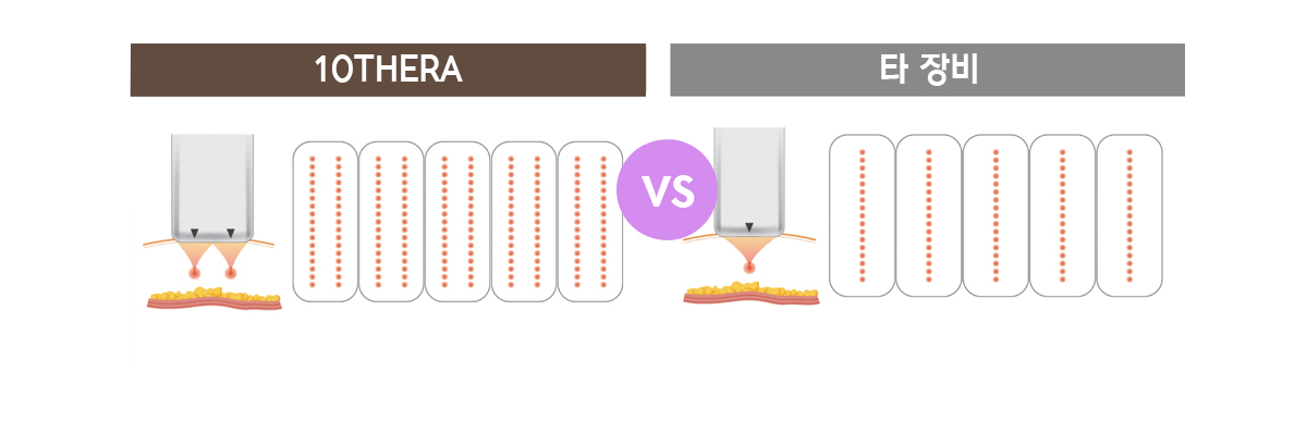 텐쎄라는 2줄에서 초음파 에너지가 동시 조사되어 열 응고점(Themal Damage) 형성 부위가 극대화됩니다. 이를 통해, 피부 재생이 진행되는 범위 역시 넓어져 탄력개선 및 리프팅 효과가 좋습니다.