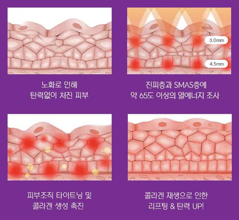 2중으로 조사하면서 열에너지를 피부 진피층과 SMAS층까지 전달하여 콜라겐 등의 재생을 촉진하여 속부터 차오르는 리프팅 효과를 기대할 수 있습니다.